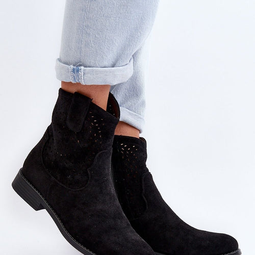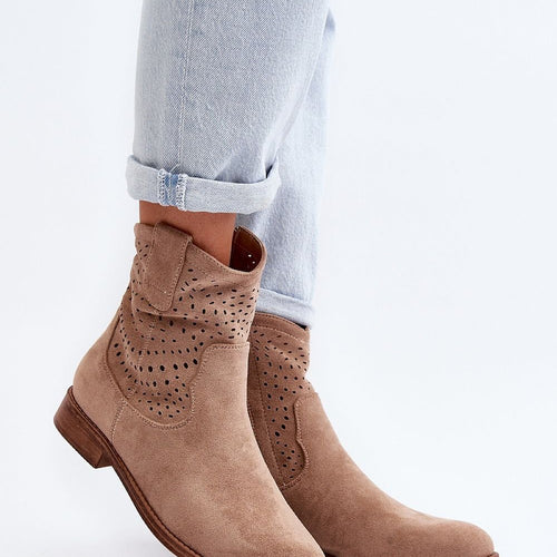 Women's boots were made of pleasant to the touch eco-suede. The model with an openwork upper fastened with a zipper. Flat heel will ensure stability on every step. Rounded toe. Perfect for almost any everyday styling! You should definitely have them in your closet! fabric imitation leather suede Footbed artificial leather Upper height 16 cm Heel height 3 cm Size...