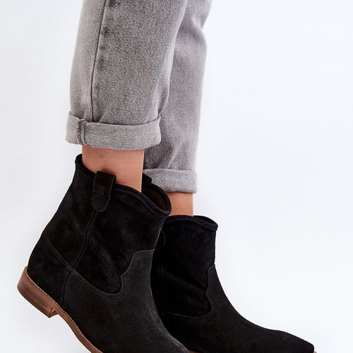 Women's boots made of natural suede. Set on a flat heel with a hidden anchor. Rounded nose pads. Insole made of natural leather will ensure comfort during use. You will match this classic model with many stylizations! fabric ~skóra naturalna zamszowa Footbed natural leather Upper height 12 cm Size Insole lenght 36 23 cm 37 23.5 cm 38 24 cm...