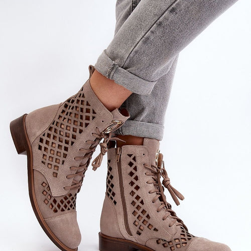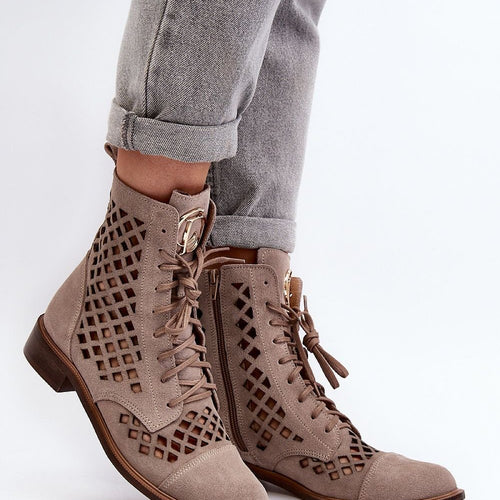 The boots were made of natural suede. Putting on will be facilitated by a zipper sewn on the side. The boots feature an openwork pattern. They have a flat heel and a comfortable insole made of natural leather. This extremely comfortable model should find a place in your closet! fabric ~skóra naturalna zamszowa Footbed natural leather Upper height 14 cm...
