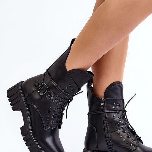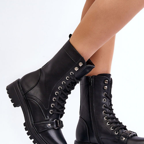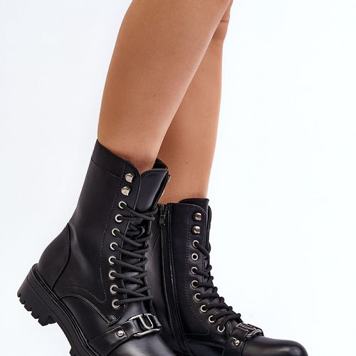 Stylish women's boots made of eco leather. Wearing comfort is provided by a flat heel, and practicality, zipper and lacing, which allows for a perfect fit. The rounded toe and front decoration add a classic touch, making them a versatile addition to many outfits. You should definitely own them! fabric artificial leather Footbed fabric Upper height 19.5 cm Heel height...