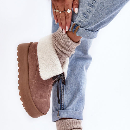 Women's snow boots are perfect for cold days. Made of eco-suede. Set on a thick platform. Insulated with sheepskin. Slip-on model. Upper decorated with binding. fabric imitation leather suede warmers ~ko?uch Footbed ~ko?uch Upper height 10 cm Platform height 4 cm Size Insole lenght 36 23 cm 37 23.5 cm 38 24 cm 39 25 cm 40 25.5 cm 41...