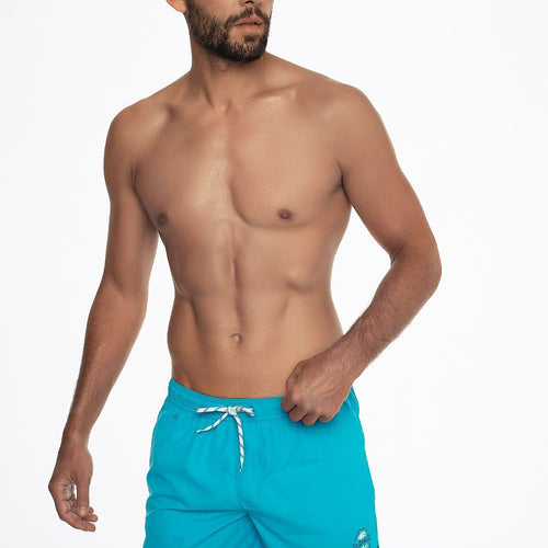 Zavier is a modern men's swimwear with a comfortable shorts cut. With loose mid-thigh legs, an elastic band tucked into a fabric tunnel and straps at the waist, they provide comfort and confidence in any situation. They were sewn from thin, pleasant to the touch, durable fabric that dries quickly. With their energetic turquoise blue hue, they will be an...