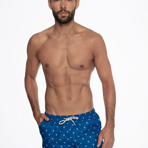 Zair is a swimwear with a loose cut of shorts ideal for the beach. The mid-thigh length legs provide freedom of movement and breathability. This model was sewn from fabric in an intense cornflower blue shade, varied with a contrasting palm tree pattern. At the waist, in addition to the elastic band hidden in the tunnel, you will find straps....