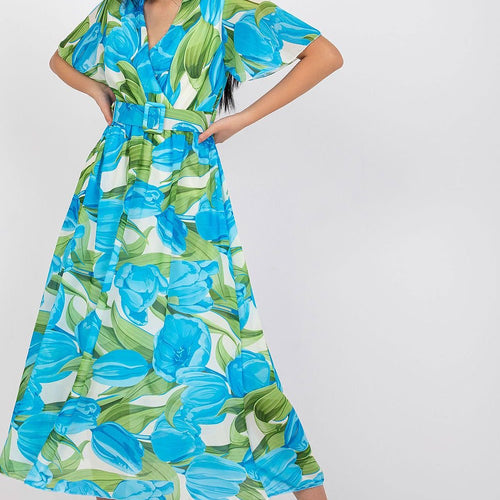 Summer dress with short sleeves in the form of frills. Dress with lining. Envelope neckline, belt at waist, pleated bottom. Ideal for many occasions. Spandex 5 % Polyester 50 % Viscose 45 % Size Total length Chest one-size-fits-all 123 cm 86 cm