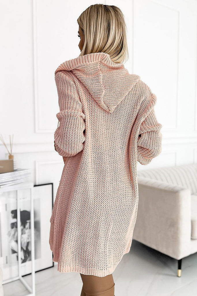 Cardigan warm bedspread with hood, pockets and a patch. Made of thicker sweater material in peach color. Brand numoco basic. European production. Acrylic 100 % Size Lenght Hips Chest Waist one-size-fits-all 81 cm 108 cm 104 cm 102 cm