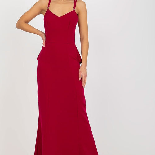 Long elegant dress with straps, zipped. Dress with fitted cut of mermaid type. Ideal for many occasions. Polyester 100 % Size Lenght Hips Chest Waist L 157 cm 82 cm 74 cm 66 cm M 156 cm 78 cm 70 cm 62 cm S 155 cm 74 cm 66 cm 58 cm