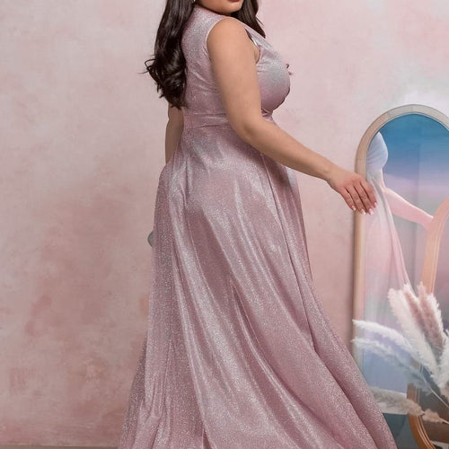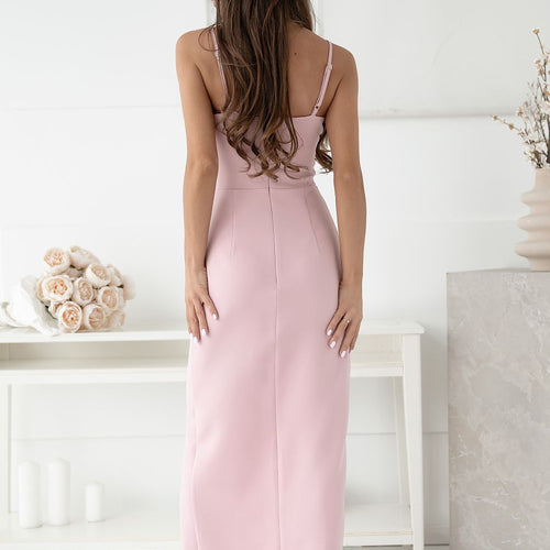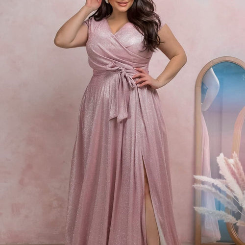 The elegant, shimmering dress in a shade of dirty pink is a perfect choice for special occasions. Made of delicately shimmering material, it gives the styling a subtle glow and a luxurious look. The wrap V-neck beautifully emphasizes the bust, and the tie at the waist shapes the silhouette, emphasizing its assets. The flared bottom with a striking slit adds...