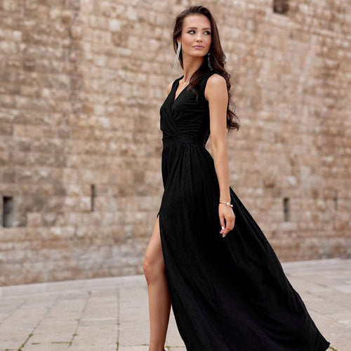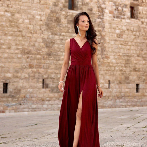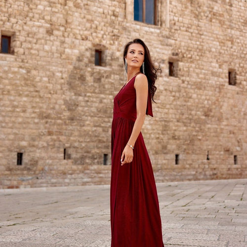 Brocade maxi dress with a tie at the back is an excellent choice among our evening dresses. The dress is stunning because of the small glittering particles in the fabric. It will shimmer beautifully in the sunlight or spotlight with all kinds of colors. The brocade maxi dress with a tie at the back is produced from a beautiful shimmering...