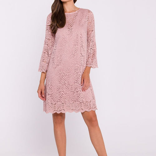 A unique trapeze double layer dress that combines classic elegance with romantic details. Made of smooth fabric on the bottom, while the outer layer is a delicate lace, which gives the whole a subtle and sophisticated look. The elbow-length sleeves are finished with a charming frill, introducing lightness and a feminine touch. The knee-length dress provides comfort and freedom of...
