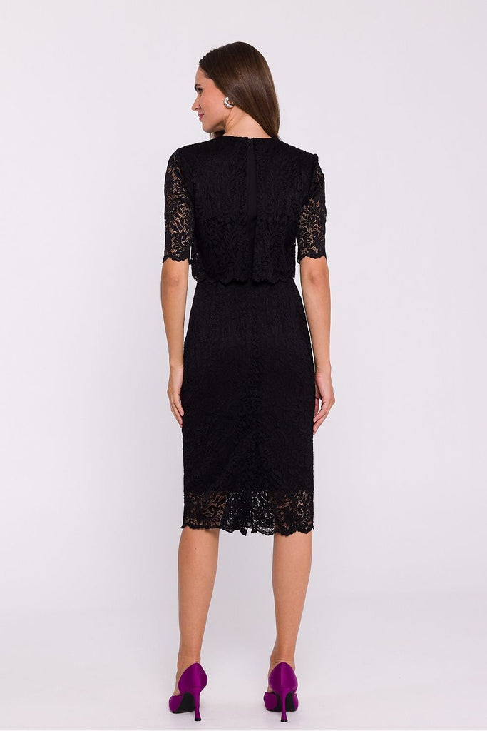 Elegant pencil dress with two layers, which combines a classic smooth fabric on the bottom with a delicate lace outer layer, creating a chic and feminine look. The dress is cut off at the waist, which emphasizes the waist and adds proportion to the figure. Short lace sleeves add lightness and subtle charm. The below-the-knee length and the slit at...