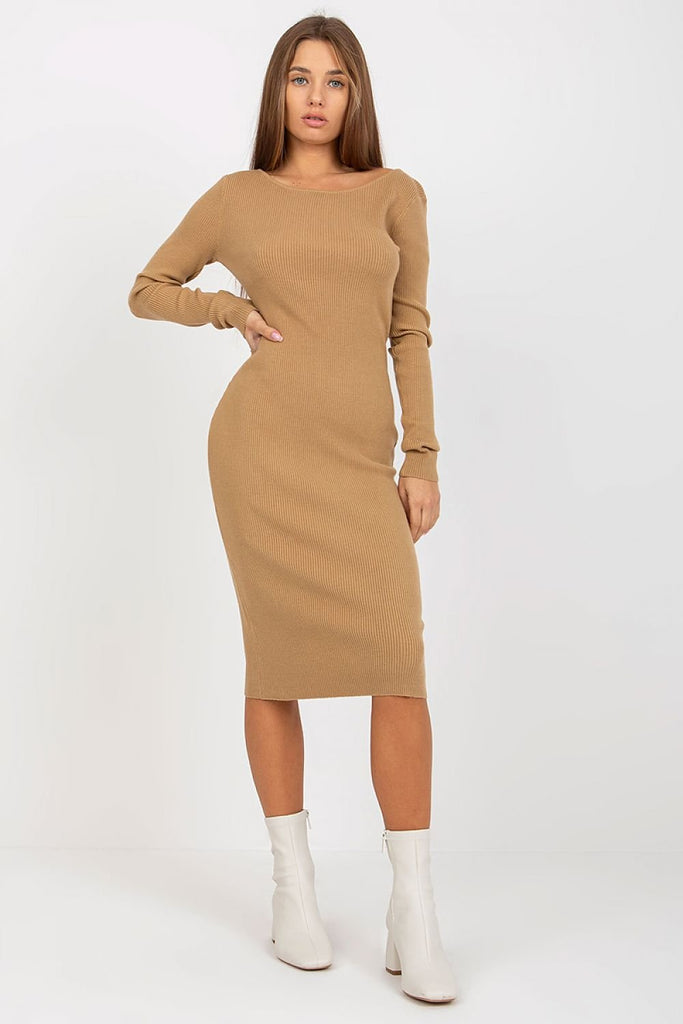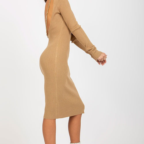 Pencil cut dress with long sleeves and a boat neckline. On the back a deep cutout with a decorative chain. Nylon 22 % Polyester 28 % Viscose 50 % Size Chest Waist L/XL 91-96 cm 84-96 cm S/M 82-86 cm 72-86 cm