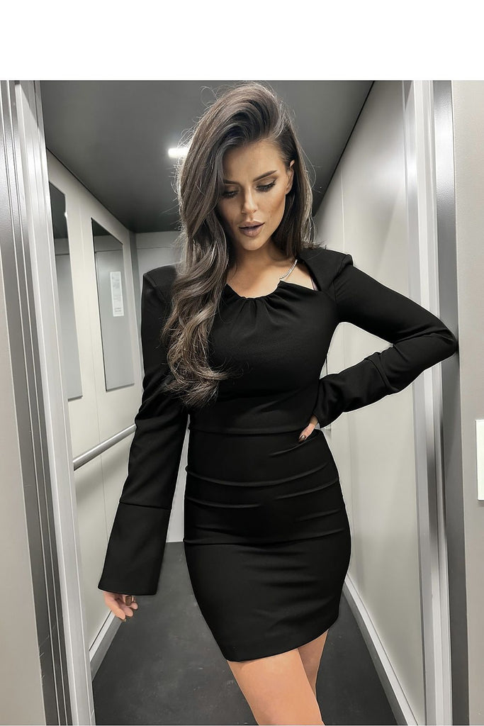 Elegant mini dress with decorative chain, long sleeves and round neckline. A proposal ideal for an evening out. Cotton 100 % Size Lenght Hips Chest Waist L 89 cm 92 cm 88 cm 84 cm M 89 cm 90 cm 84 cm 80 cm S 89 cm 86 cm 82 cm 76 cm