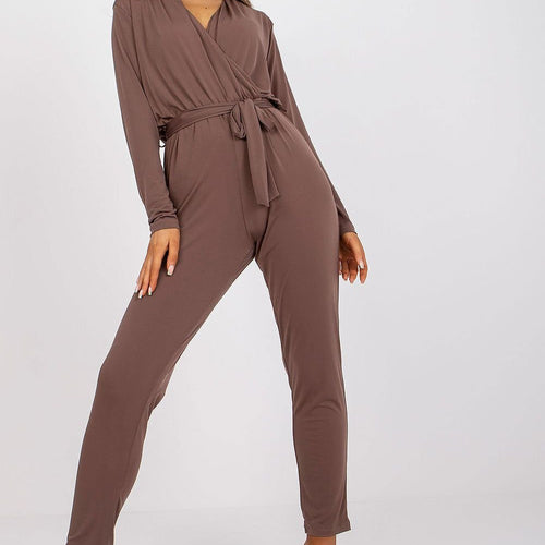 Ladies' long-sleeved jumpsuit. Envelope front with a tie at the waist. Ideal for everyday and not only. Spandex 10 % Polyester 90 % Size Total length Chest one-size-fits-all 138 cm 92 cm