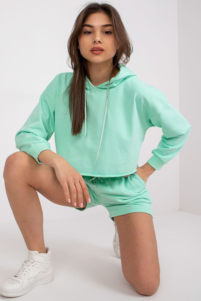 A set consisting of a sweatshirt and shorts. Sweatshirt with long sleeves and a hood. Short shorts with drawstring, side pockets. Cotton 70 % Polyester 30 % Size Lenght Chest Waist one-size-fits-all 41/38 cm 108 cm 62 cm