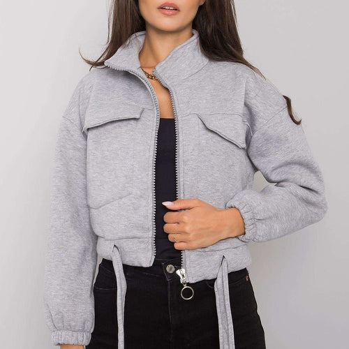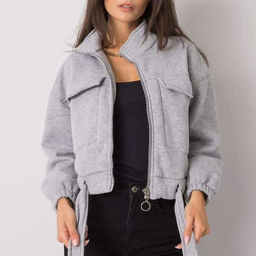 Grey women's zipped sweatshirt with long sleeves. Pockets at the front, tied at the waist. Cotton 72 % Spandex 6 % Polyester 22 % Size Sleeve internal lenght Sleeve external lenght Chest L 53 cm 63 cm 91 cm M 51 cm 61 cm 86 cm S 49 cm 59 cm 82 cm