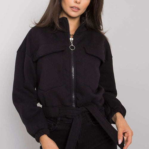 Black women's zipped sweatshirt with long sleeves. There are pockets at the front and a tie at the waist. Cotton 72 % Spandex 6 % Polyester 22 % Size Sleeve internal lenght Sleeve external lenght Chest L 53 cm 63 cm 91 cm M 51 cm 61 cm 86 cm S 49 cm 59 cm 82 cm