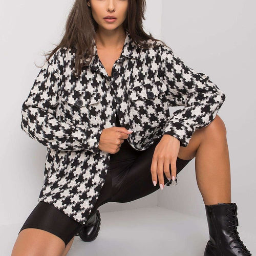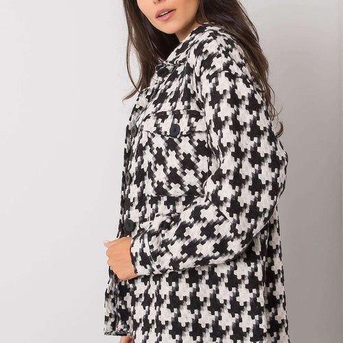 White and black women's button-down shirt. Pockets at the front. Spandex 10 % Polyester 60 % Viscose 30 % Size Sleeve internal lenght Sleeve external lenght Chest L/XL 53-55 cm 63-65 cm 91-96 cm S/M 49-51 cm 59-61 cm 82-86 cm