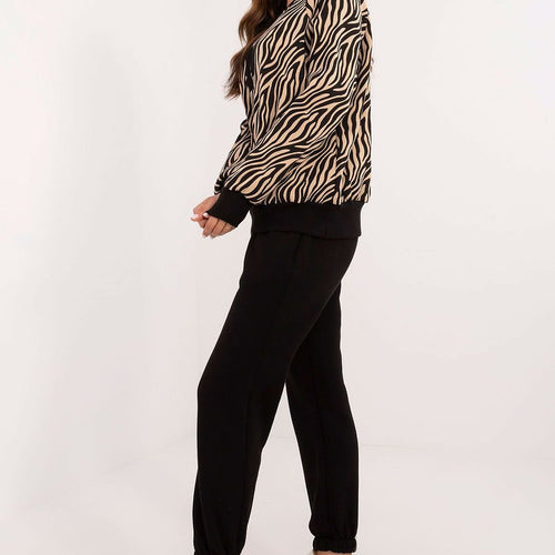 The women's casual style set, ideal for everyday wear, consists of three pieces: a T-shirt, a sweatshirt and pants. The set is distinguished by a smooth pattern, with a delicate accent of an animal motif, which adds to its modern and fashionable character. The predominant material is a blend of cotton and polyester, ensuring wearing comfort and durability. The pants...