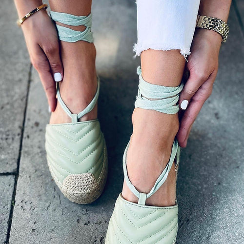 Quilted espadrilles for women. Shoes have high sole (4 cm) finished with linen string and tie that sensually wraps ankle. They are an absolute hit this summer! Not only they look great, but also are very comfortable. Don't wait and order them today: ) Outer material - ecological leather / fabric (blue color) fabric artificial leather Sole height 4 cm...