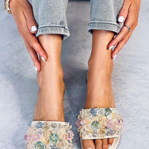 Women's flip-flops on a flat heel. The eye is attracted by a wide strap decorated with colorful and glittering stones : ) Wow effect guaranteed! Give them a chance to conquer your closet, and you won't regret it.... Outer material ? ecological leather. fabric artificial leather Size Insole lenght 36 23,5 cm 37 24 cm 38 24,7 cm 39 25,5...