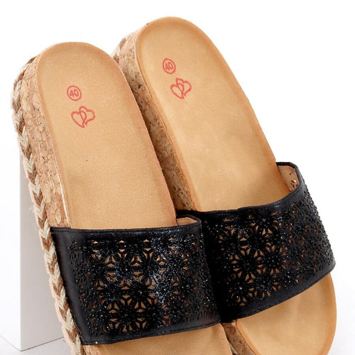 Women's flip-flops on a cork sole. They are unique because of unique, openwork pattern decorated with delicate stones... Linen braided sole and shimmering finish emphasize the summer character of this model, and the profiled insole is comfortable for the foot. Outer material - leather-like fabric. fabric ~tkanina skóropodobna Sole height 3,5 cm Size Insole lenght 36 22,5 cm 37 23...