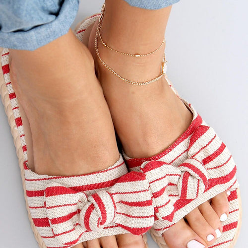 Women's flip-flops on a flat sole. A beautiful bow on the front and a summer striped pattern make them impossible to take your eyes off! This model, together with an airy dress, will create a fashionable summer look, and at the same time you will enjoy the comfort of every step... Outer material ? fabric. fabric fabric Size Insole lenght...