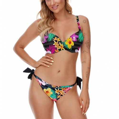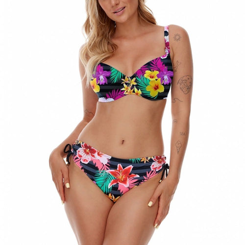 Bikini bra in the form of an underwired bralette. Made of knitted fabric with a motif of exotic flowers in juicy colors against a background of horizontal gray and black stripes. Soft cups with vertical cut perfectly support medium and large breasts. The costume ties at the neck and fastens at the back. Pants are sold separately. Spandex 15 %...
