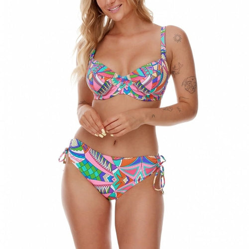 Bikini bra in the form of a bralette on underwire. It perfectly presents medium and larger busts. Soft cups with vertical cut made of knitted fabric in many beautiful, bright and vivid colors combined in an irregular geometric pattern. The bra's construction ensures full comfort of wearing and excellent bust support. The bra ties at the neck and fastens at...