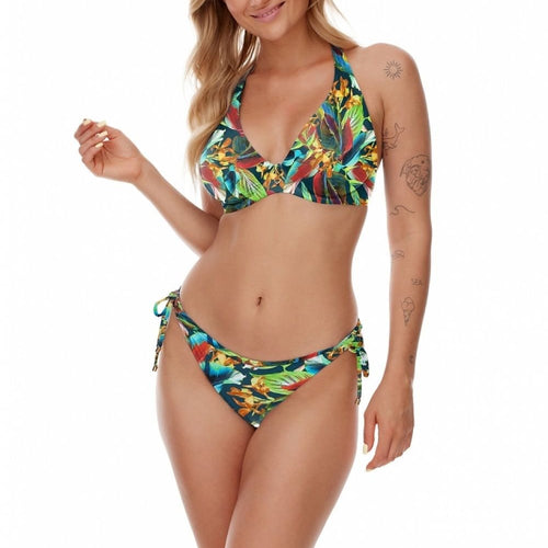 Two-piece swimsuit in a lovely blue color like the azure of water and the sky during beautiful weather with the addition of colorful summer motifs. An interesting beachwear model with a soft bra tied at the neck and back. The cups are decorated with an attractive eye-catching print. The bottom underwires lift the breasts up and hold them wonderfully on...