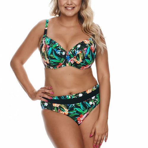 One-piece swimsuit, created for women with fuller shapes, perfect to use both on the beach and at the pool. The cut of the swimsuit combines functionality and elegance. The swimsuit has a bra with soft underwired cups and adjustable, non-removable shoulder straps. The width and type of straps are matched to the size of the swimsuit. Insertions of black fabric...