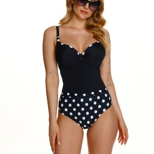 One-piece costume made of knitted fabric in black color and white peas, perfect for use both on the beach and in the pool. The cut of the swimsuit combines functionality and elegance. The swimsuit has a sewn-in bra with underwire push-up cups and adjustable, non-removable straps. The panties part is made of knitted fabric with peas. The back of the...