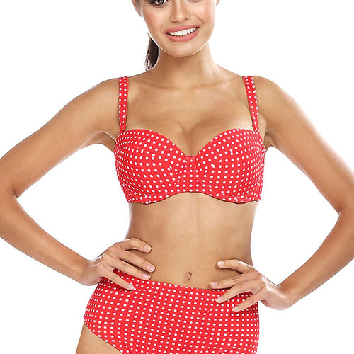 Two-piece swimsuit - has a delicate foam bowl - wires and vertical underwire support and shape the breasts - sides reinforced with additional mesh - straps detachable, adjustable - metal hooks for straps - comfortable buckle fastening at the back - higher-waisted panties Spandex 13 % polyamide 87 % Size Hips Underbust Chest Bottom size Cup Size 36/70B 92-95 cm...