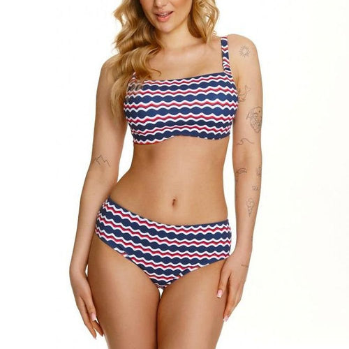 Swimsuit designed for large busts, made of lycra with horizontal irregular waves in navy blue, white, and red. The color scheme is reminiscent of a nautical style. The top of the swimsuit is in the form of a bandeau. The adjustable non-detachable straps. The width of the straps and the type of closure are tailored to the size of the...