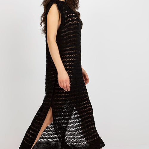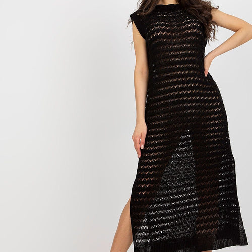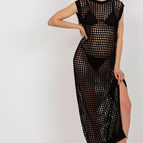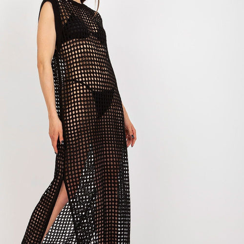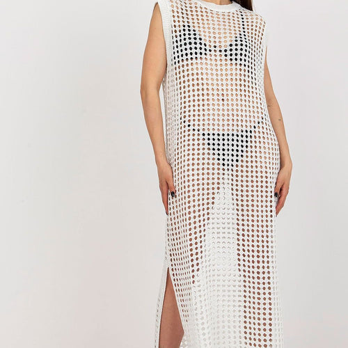 Openwork long knit sleeveless dress with decorative slits on the sides. The dress is perfect for the beach and beyond. Acrylic 70 % wool 30 % Size Total length Chest one-size-fits-all 134 cm 96 cm