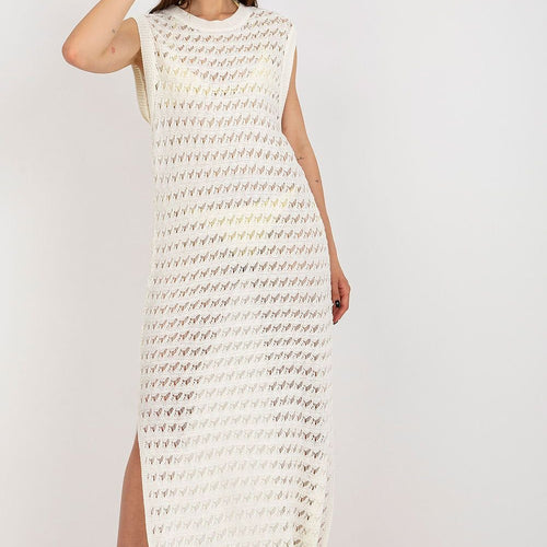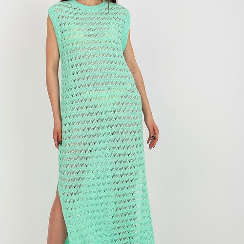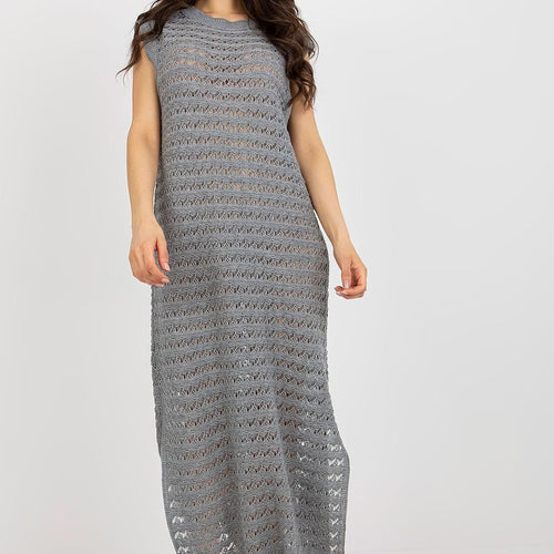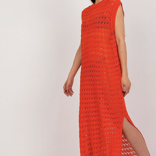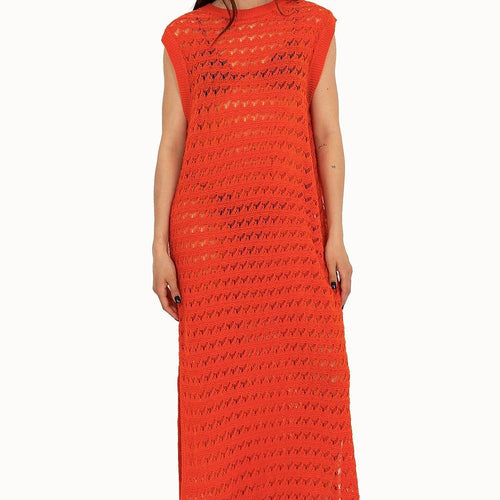 Openwork long knit sleeveless dress with decorative slits on the sides. The dress is perfect for the beach and beyond. Acrylic 70 % wool 30 % Size Total length Chest one-size-fits-all 134 cm 96 cm