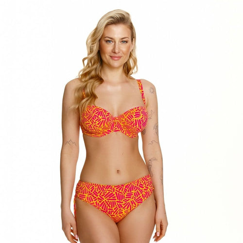 Beautiful swim bra in a typically holiday color scheme. The model delights with its color scheme. The colors that dominate here are yellow and orange. The bra has soft cups with modeling cuts and is padded with underwire, so it perfectly supports medium and large breasts. The straps are adjustable, non-removable. The width of the straps and the type of...