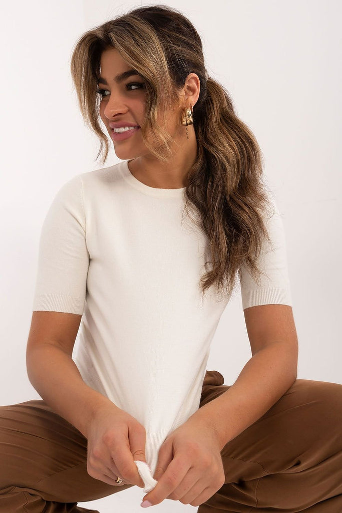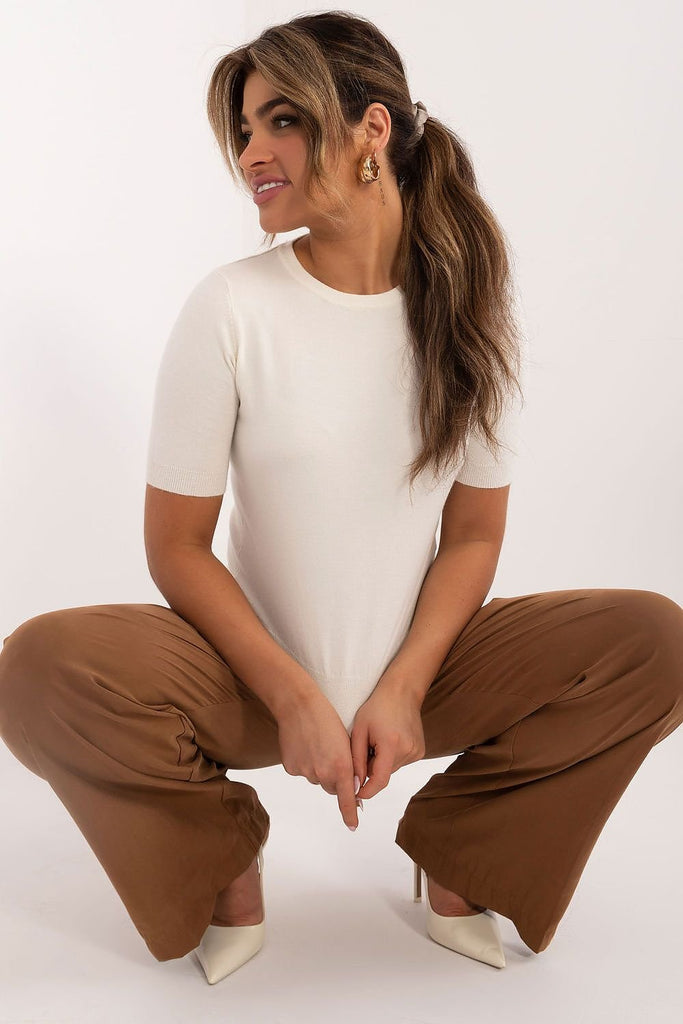 Women's short-sleeved casual sweater, perfect for everyday wear and work. Made of high-quality viscose with added elastane and polyamide, which provides softness and comfort when wearing. The sweater is characterized by a smooth, uniform pattern that adds elegance and versatility. It has a classic, round neckline that emphasizes the neck. Its standard length makes it easy to match with different...