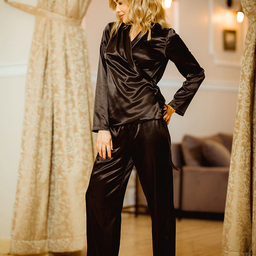 Satin set Rawa is undoubtedly a proposal for an elegant, self-confident woman. At first glance it resembles a master women's suit, but the satin from which it is made gives it the character of exceptional pyjamas. Widely cut trousers give freedom of movement. The envelope-shaped blouse nicely and flirtatiously emphasizes the waist. Ideal for an elegant gift. Underwear packed in...