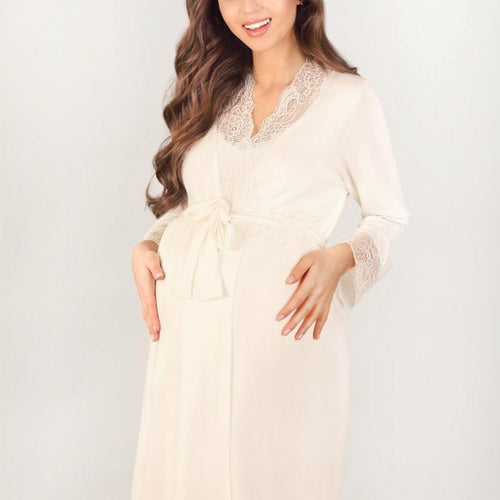 Extremely delicate, feminine dressing gown dedicated to future mums. Beautiful lace finish at the neckline and on the sleeves. Soft, elastic knitwear, very pleasant to touch. The ecru colour and minimalistic form give it a chic and glamorous look. Every mum can look elegant and feel comfortable thanks to it. Ideal for pregnant women and nursing moms. Spandex 20 %...