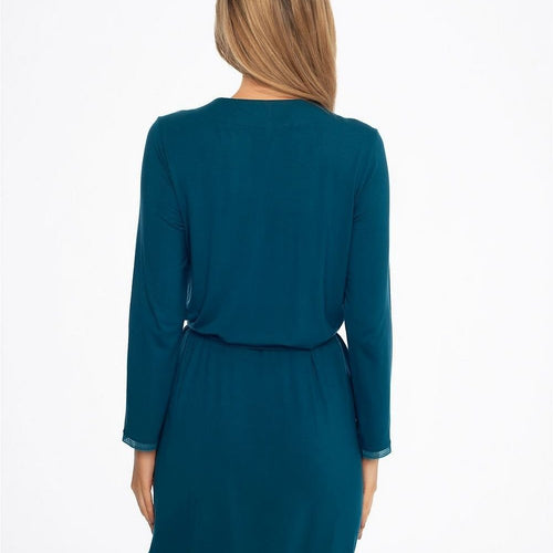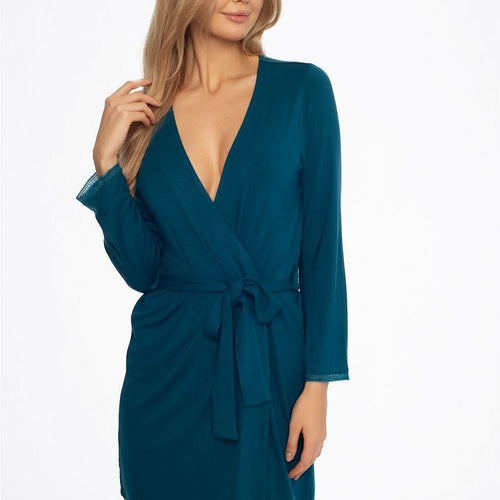 Alena bathrobe is a proposal for women who are looking for a lightweight garment for summer evenings. It was sewn from a soft-to-the-touch knitted fabric in a deep sea shade. The mid-thigh length women's bathrobe is tied at the waist with a long belt, so you can easily adjust it to your figure. Spandex 5 % Viscose 95 % Size...