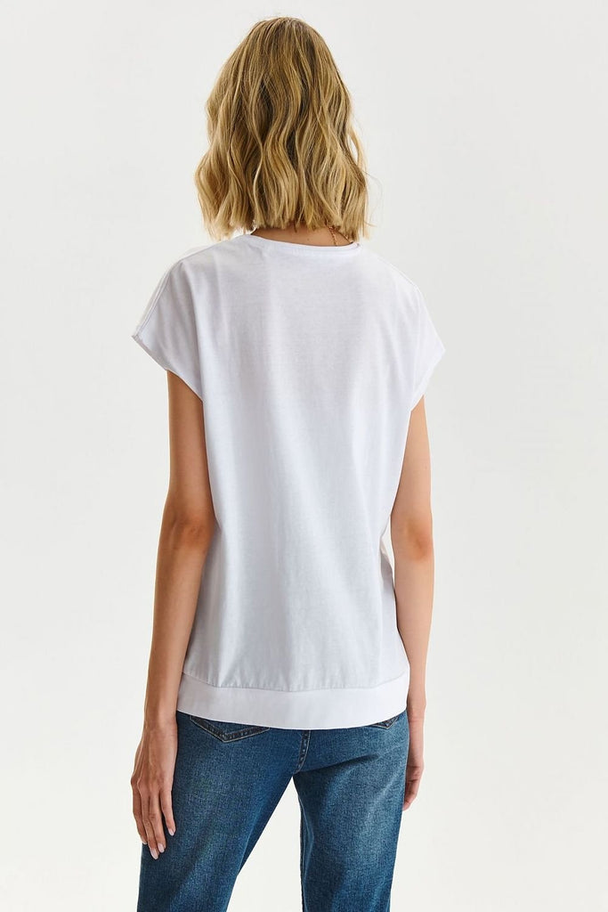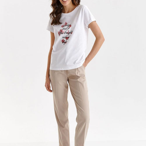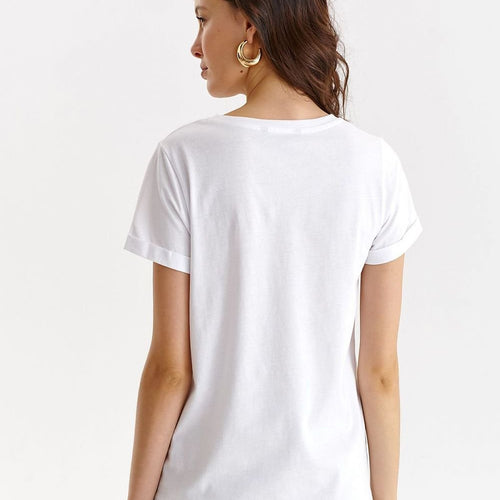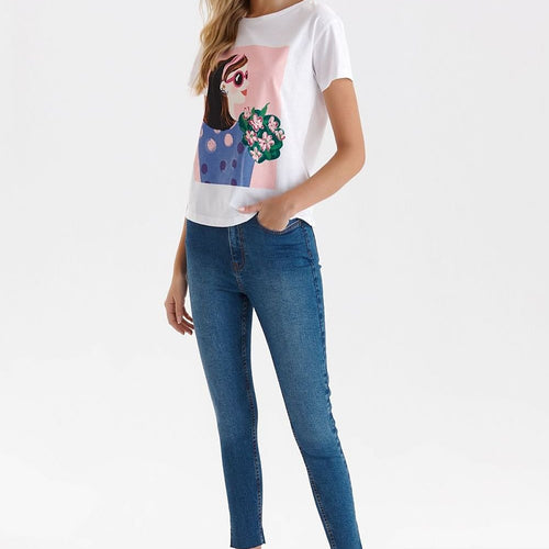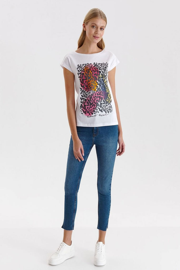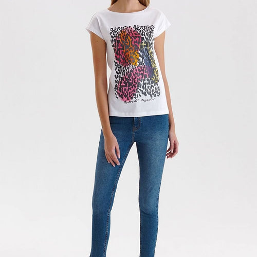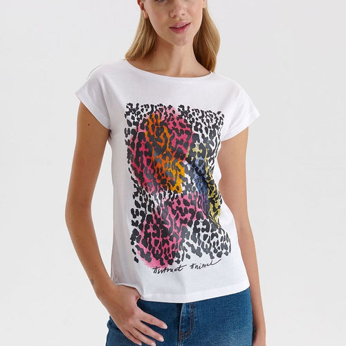 Women's straight cut t-shirt with a boat neckline and short sleeves. Decorative print on the front. Cotton 90 % Spandex 10 % Size Chest L 90-93 cm M 86-89 cm S 82-85 cm XL 94-97 cm