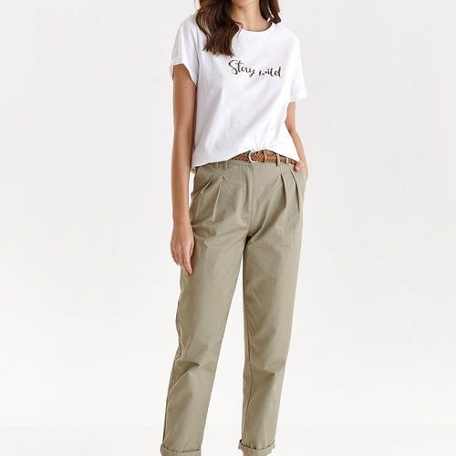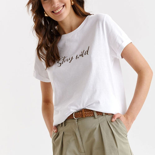 Captivating with its unparalleled comfort and great wearability, this classic women's T-shirt has a simple loose fit with short sleeves ending in a striking turn-up. It has an impressive slightly oval neckline and is enriched with a fancy inscription on the front at bust level. It was made of very pleasant to the touch and soft cotton fabric, being a...