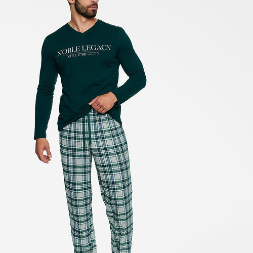 HENDERSON TOWN men's pajamas is a two-piece sleep set that consists of a long-sleeve blouse and long pants. The blouse is characterized by a V-neck and bright stitching on the shoulders. The eye is attracted by a large inscription printed at chest height. The plaid flannel pants have straight, loose legs and an elastic waistband with strings for adjusting the...
