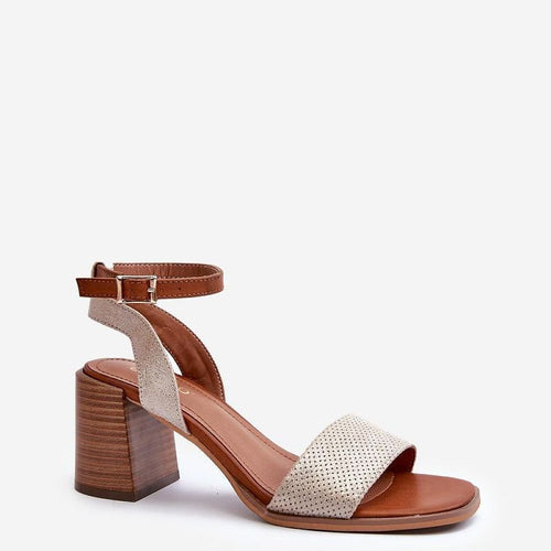 Women's sandals made of eco leather. Set on a heel in the form of a post. Fastened with an adjustable strap with a buckle, they guarantee a perfect fit to the foot. Two straps on the front, additionally one is trimmed with shiny thread, adding a delicate shine to them. These sandals will be a perfect addition to any summer...