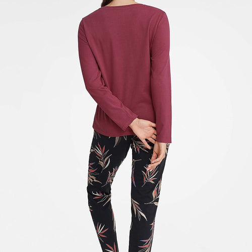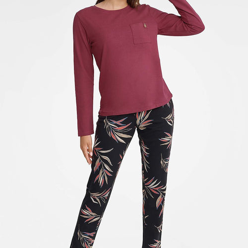 Women's two-piece pajamas is a set that will allow you to combine fashion and comfort. The upper part of the set is a burgundy blouse with long sleeves and a half-round neckline. The lower part of the set consists of patterned pants with loose legs and an elastic waistband. Cotton 100 % Size Hips Chest L 100-104 cm 94-98 cm...