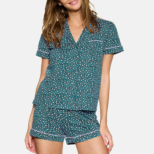 Ladies' two-piece pajamas with a leopard print pattern. Elegant pajamas consisting of a short-sleeved button-down shirt and short shorts. The top of the pajamas has a classic collar and a small pocket on the front left side. The shorts with a comfortable drawstring waist and additional ribbon allow for a perfect fit. The short sleeves and legs of the shorts...
