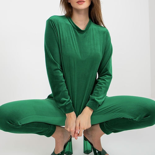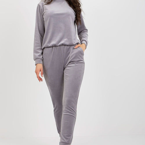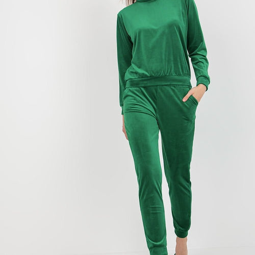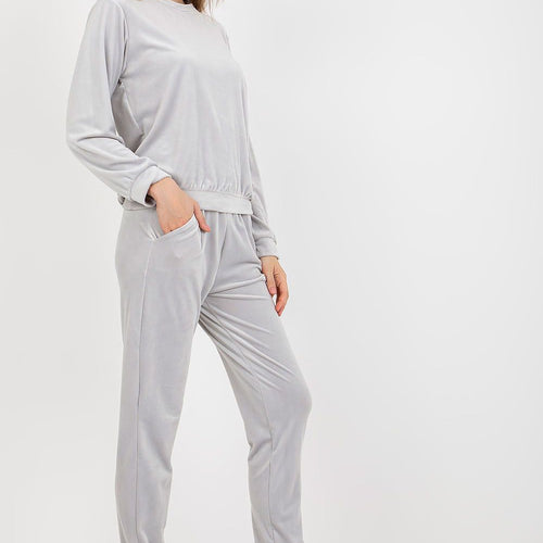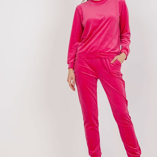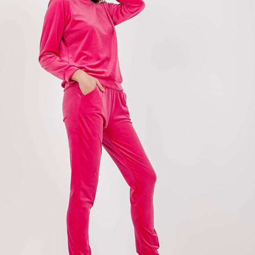 Ladies' velour set consisting of a blouse and pants. Blouse tucked in over the head, with long sleeves. Long pants with elastic waistband, slip pockets on the sides. Cotton 95 % Spandex 5 % Size Lenght Chest Waist S 61/95 cm 100 cm 68 cm