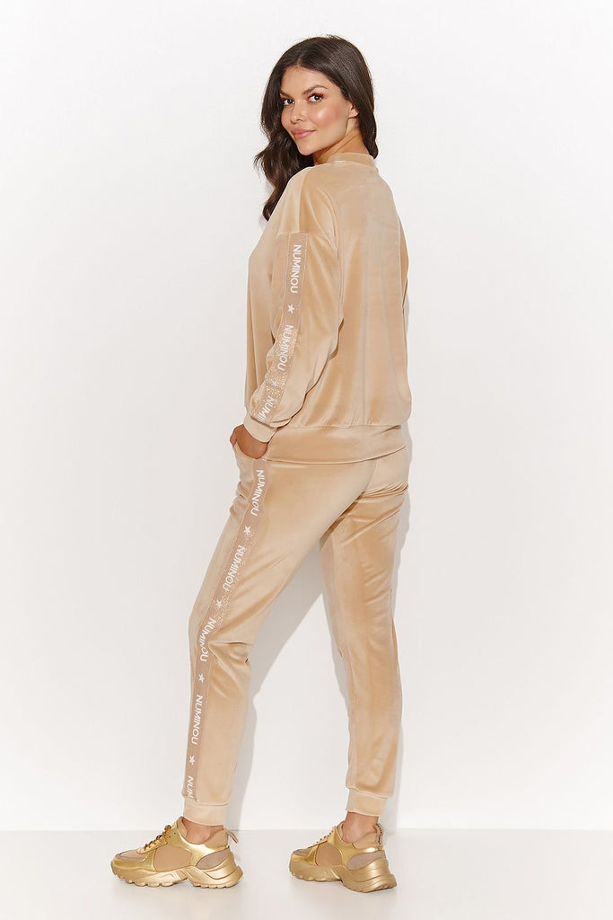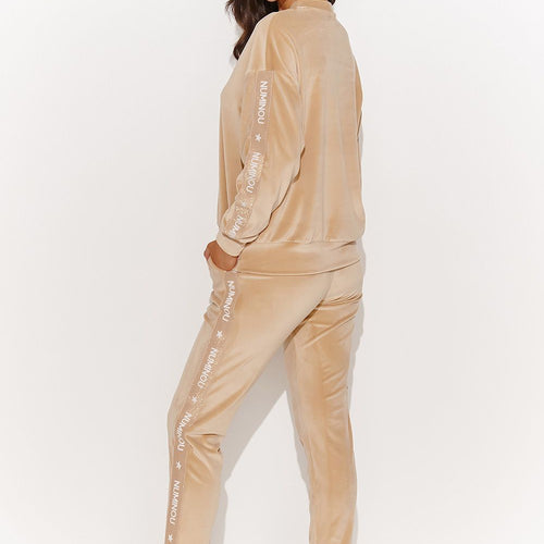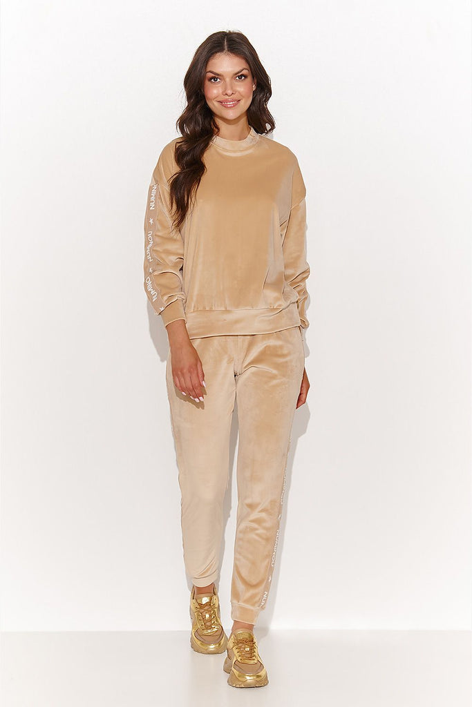 This women's sweatshirt set made of velour knit is a combination of comfort and elegance. The long-sleeved sweatshirt has a fairly built-in round neckline. The simple cut makes the set very versatile. The blouse is worn over the head. Inscription trimmings are present on the sleeves and on the sides of the pant legs. They add a casual style to...