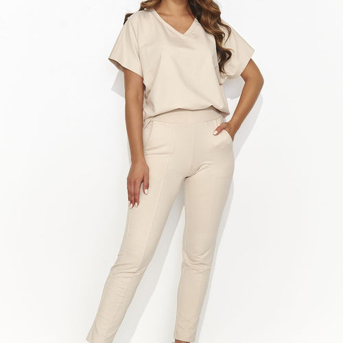 Elegant yet comfortable knitted set that combines an oversize shirt with long pants. The loose blouse with wide, short sleeves decorated with a charming blouse, harmoniously harmonizes with the matching long tube pants, finished with stitching along the entire length. The pants have practical side pockets. In this set you will feel casual and confident, while maintaining elegance. Perfect for...