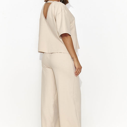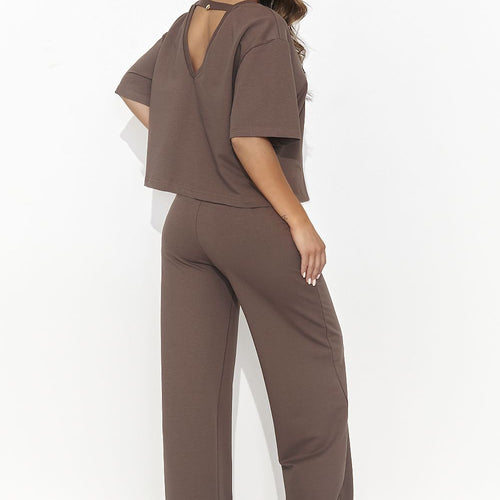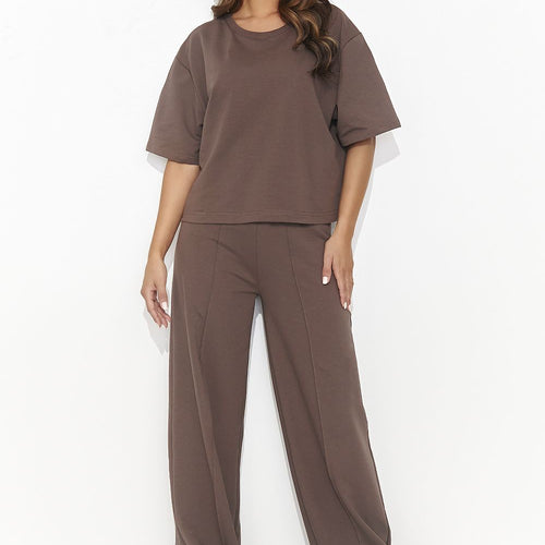 This stylish women's tracksuit set is a combination of comfort and elegance. It consists of a casual short-sleeved T-shirt, which has an eye-catching cutout at the back decorated with a gold plate, adding subtle elegance. The set is complemented by casual long pants with a wide leg, decorated with full-length stitching, which gives them a modern touch. The set is...